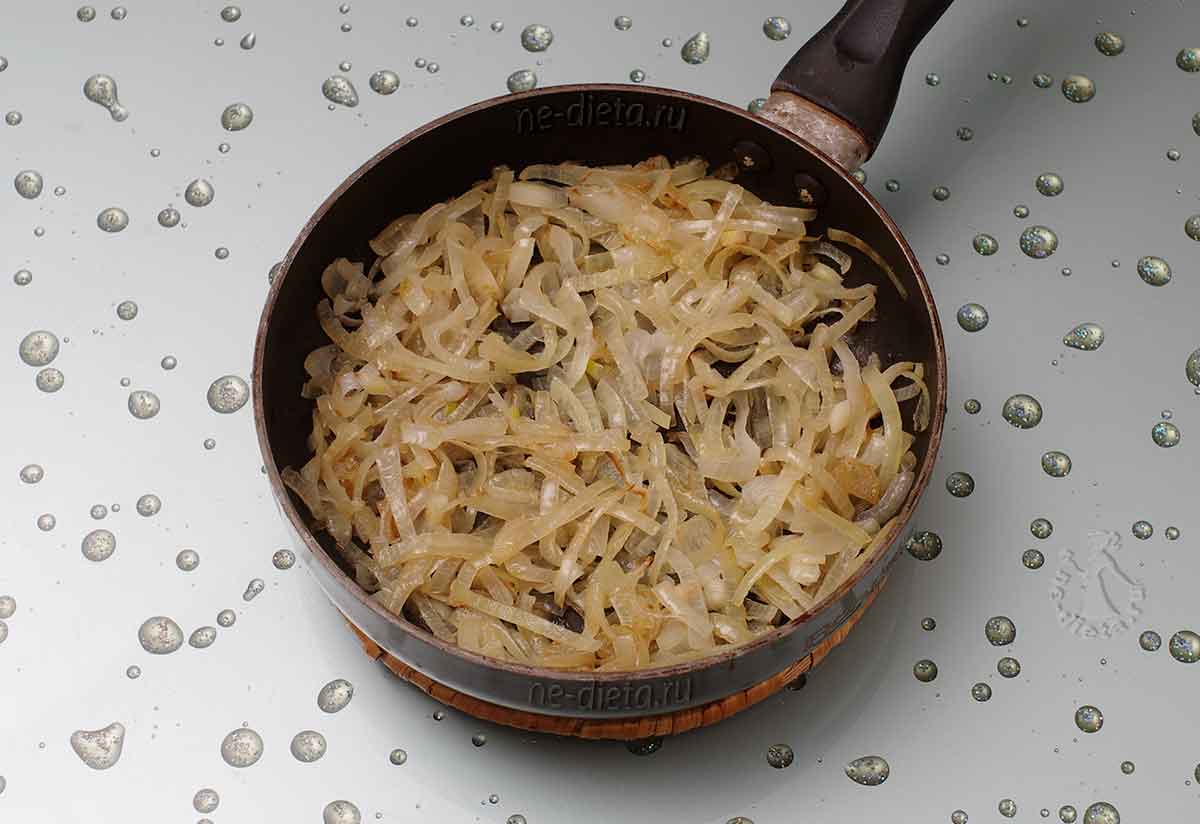 2) шампиньоны промойте под проточной водой, осушите и обжарьте на подсолнечном масле вместе с нарезанным мелко луком;