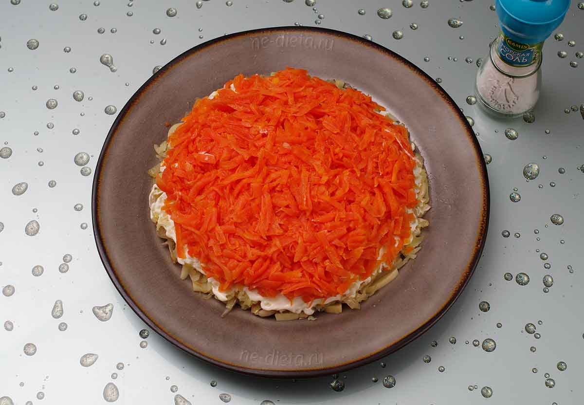 Следующим слоем необходимо положить тертую морковку, слегка прижать ее руками, чтобы выпустить лишний воздух, и посолить.