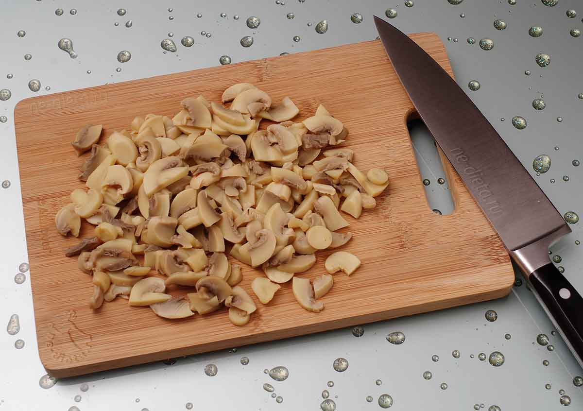 Консервированные шампиньоны лучше покупать в нарезанном виде, поскольку это и удобно, и бюджетно, однако даже в таком виде они бывают крупноваты и требуют дополнительного измельчения.