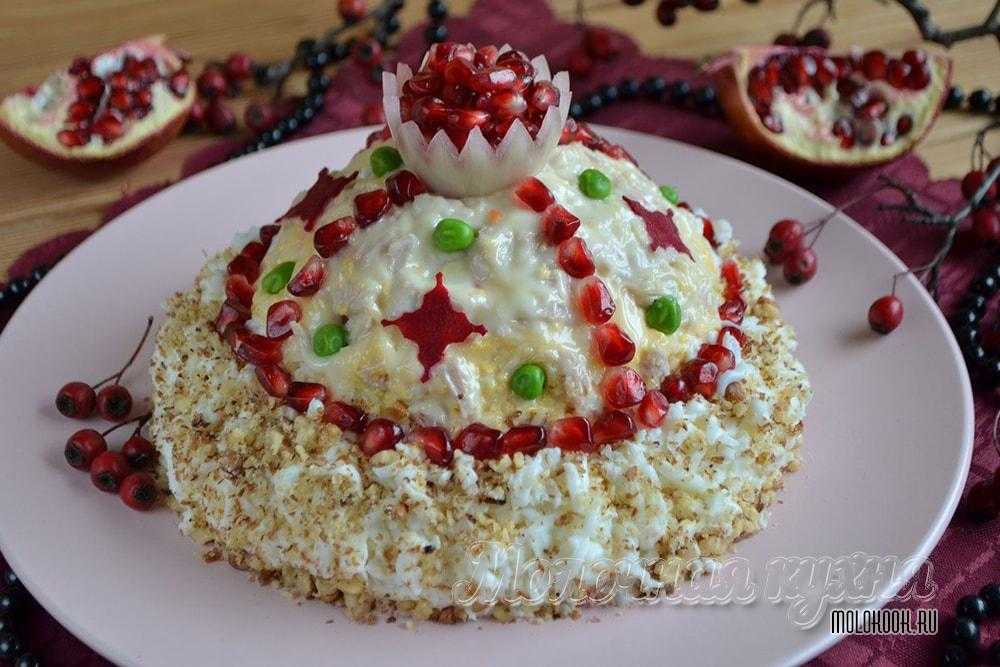 Коронный салат советских хозяек состоит из нескольких слоев, при его приготовлении используются недорогие и доступные продукты. Существует несколько вариаций: с курицей, мясом или рыбой. Но форма остается неизменной – в виде шапки, украшенной «драгоценными камнями».