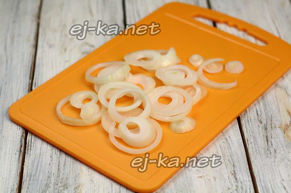 - Так же, как и в предыдущем рецепте, панируем лучок в муке и обжариваем в большом количестве рафинированного подсолнечного масла до появления янтарной корочки.