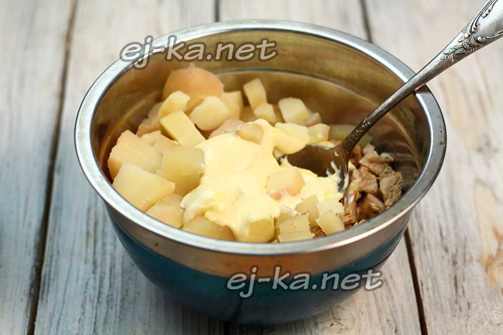 4. Отварной картофель натираем на крупной терке или мелко нарезаем ножиком, кому как удобно. С помощью ложки все содержимое кастрюли слегка утрамбовываем, чтобы ингредиенты плотнее прилегали друг к другу. Сверху смазываем майонезом, по желанию можно немного посолить.