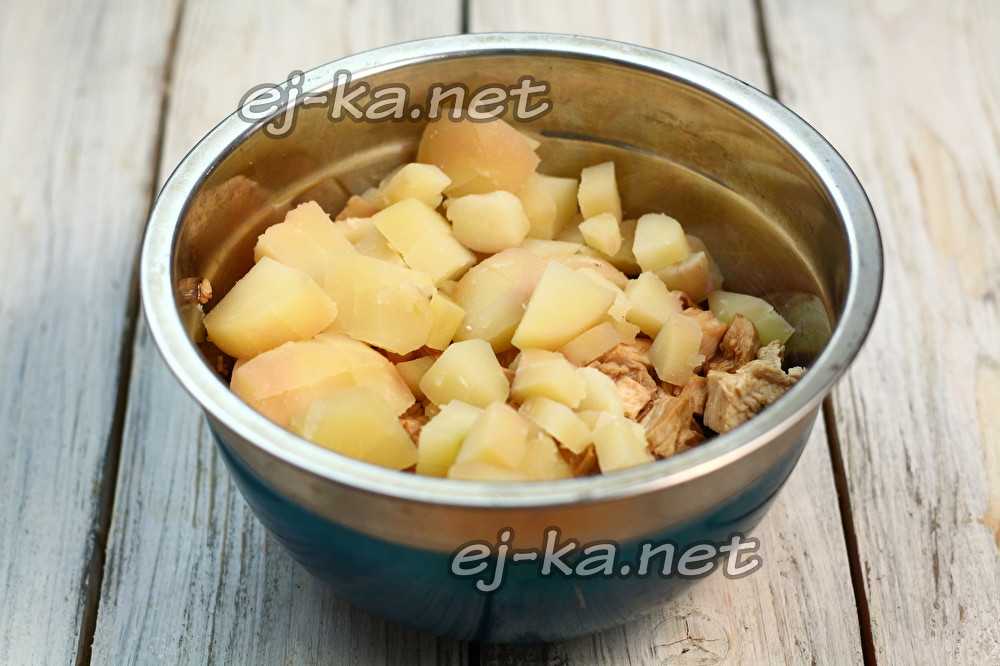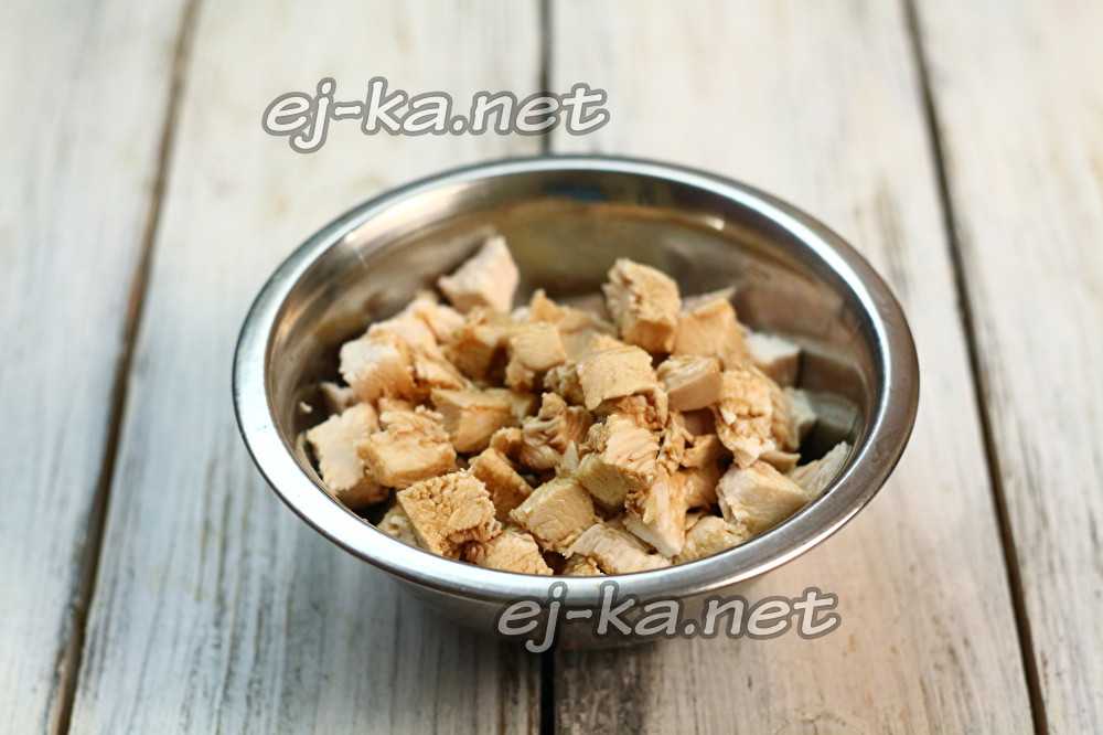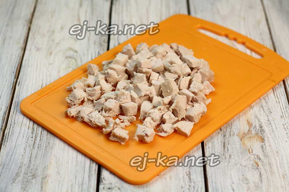 - Остужаем отварное мясо птицы и нарезаем небольшими кубиками.