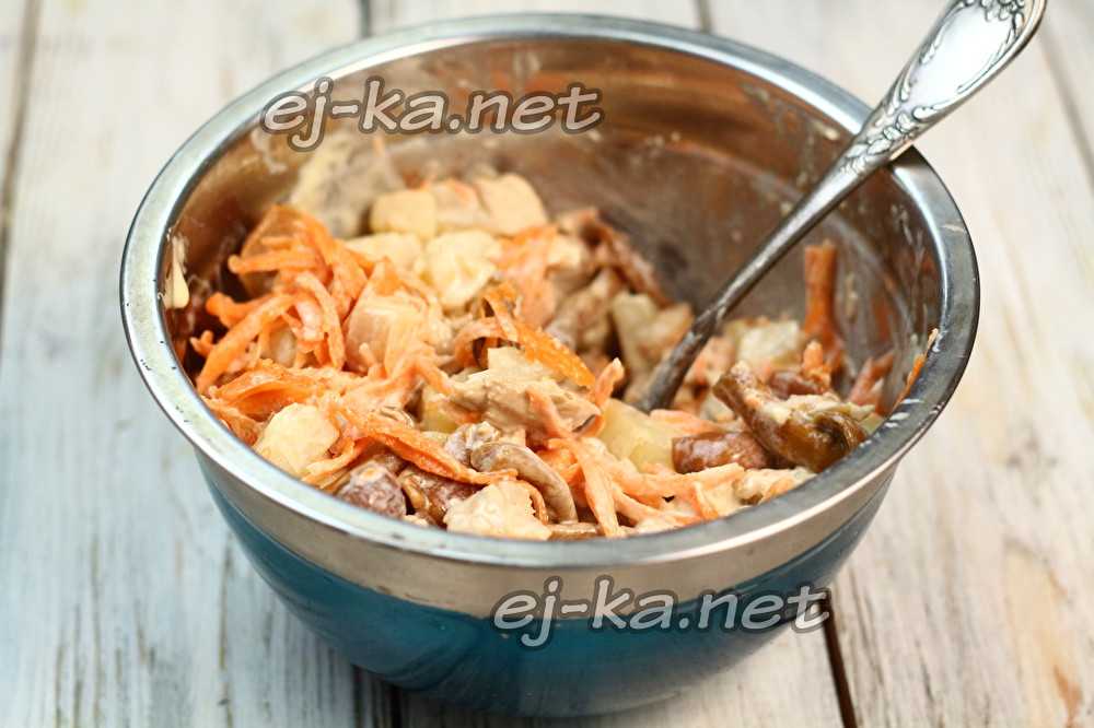 Остренький салат «Жар – Птица» с курицей, картофелем, опятами, корейской морковкой