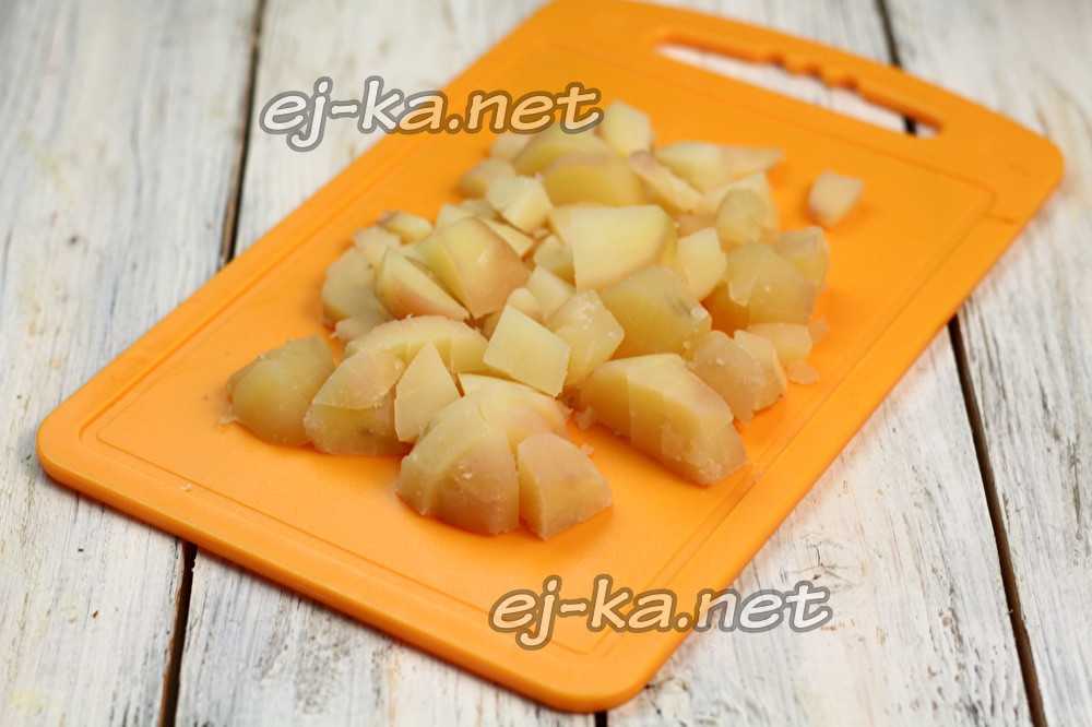 Отвариваем картофель. Нарезаем в форме кубиков.