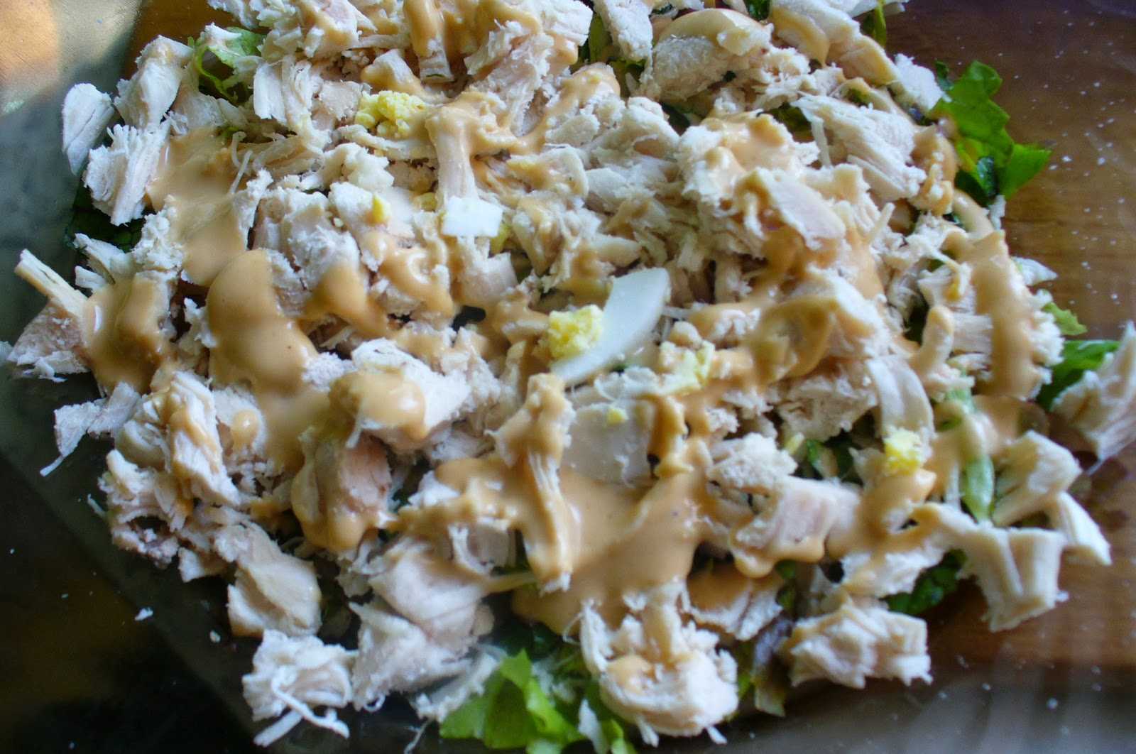 Щедро полейте соусом наш слоеный салат с куриной грудкой.