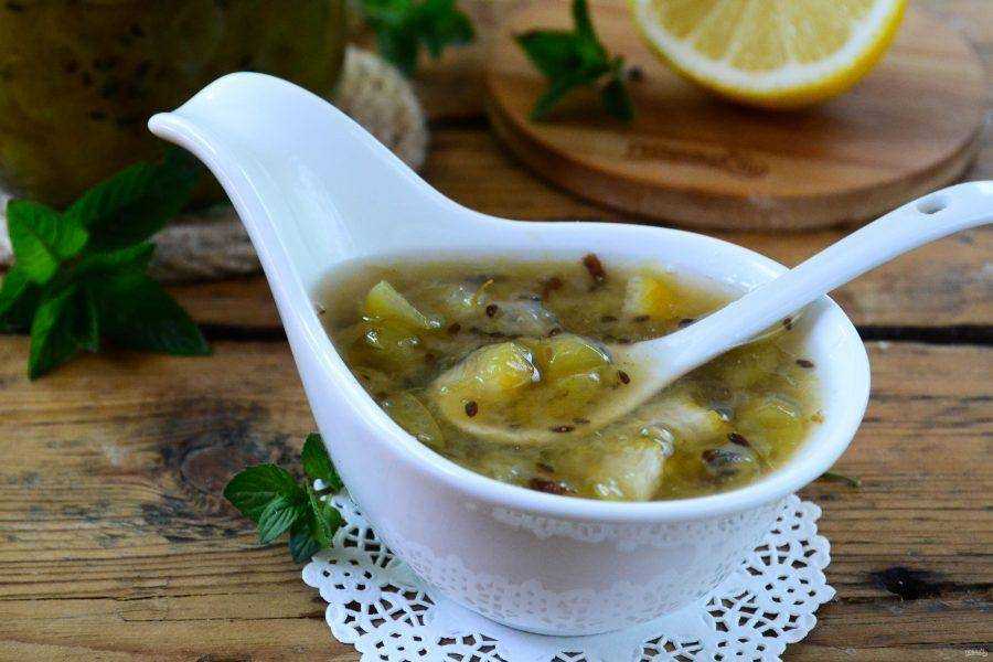 Готовить сладкую заготовку из крыжовника на зиму можно различными способами. Тут все зависит от терпения, желания хозяйки. Очень вкусным бывает крыжовник и с лимоном, и киви. А истинно царское блюдо получится с грецким орехом, который кладут в каждую ягодку.