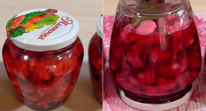 Делим капустные головы на отдельные веточки, промываем под струей холодной воды, также моем и чистим свеклу с морковью, которые затем следует измельчить на терке. В стерилизованные банки укладываем вперемешку все подготовленные овощи, чеснок и перец горошком, после чего заливаем рассолом и убираем в теплое место, накрыв марлей. Заливка может быть холодной или горячей, в первом случае выдерживаем заготовку неделю, а во втором – не больше 4 дней. По истечении указанного срока укупориваем крышками и убираем в прохладу.