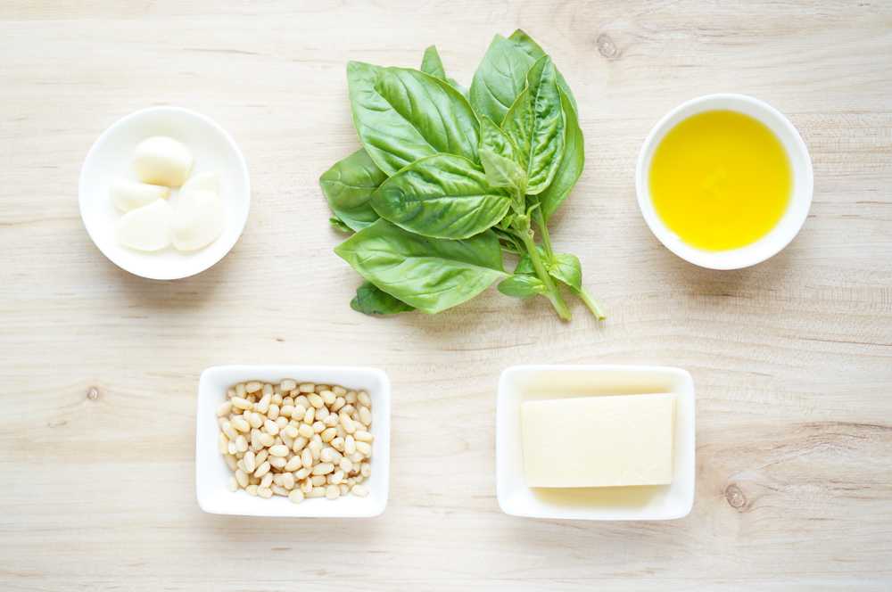 Песто относится к соусам из измельченных ингредиентов. Основой ему служат зеленый базилик сорта Геновезе, семена пинии, оливковое масло, твердый овечий сыр – пармезан или пекорино. Существует много вариантов песто, отличающихся дополнительными компонентами. В Италии соус часто делают с миндалем, свежими и вялеными томатами, в Австрии добавляют семечки тыквы.