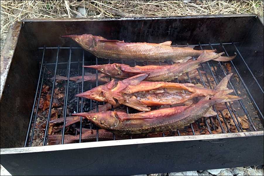 - Через полчаса после появления дыма из специального отверстия оценить готовность закопченного осетра.
