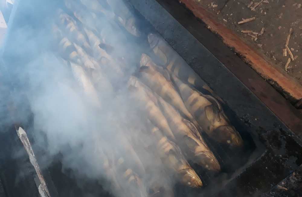 Каждый кусок рыбы подвешивают внутри коптильни, накрывают крышкой. Коптят на протяжении двух суток на медленном огне. На дно коптильни насыпают буковые или ольховые опилки, предварительно замоченные в воде. Благодаря им дым будет получаться легким и ароматным.