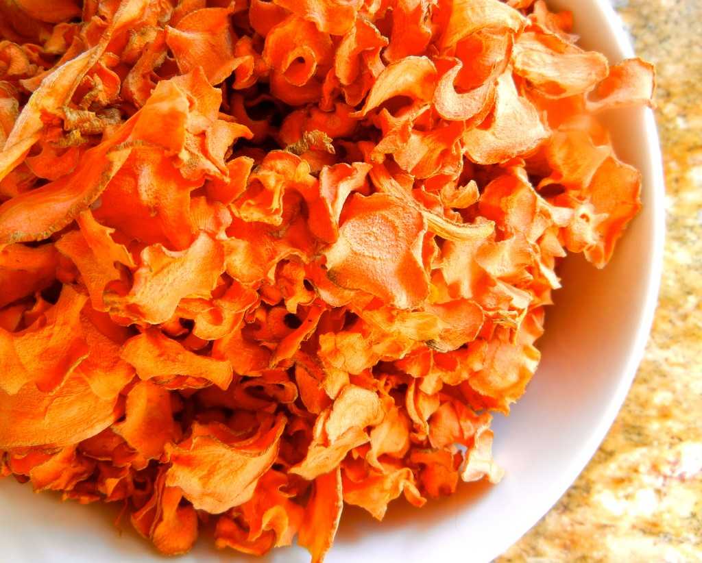 Как сушить морковь в электросушилке? Чтобы сделать такую заготовку, вымойте и почистите овощи. Используйте острый нож либо электросушилку, чтобы нарезать корнеплоды очень тонко. Разложите подготовленные слайсы на лоток дегидратора. При желании можно посыпать их морской солью.