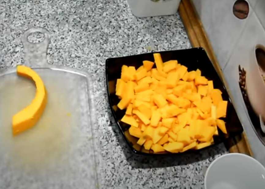 - Тыкву чистим, выскабливаем середину, режем топкими ломтиками, кубиками, брусочками — как душа желает.