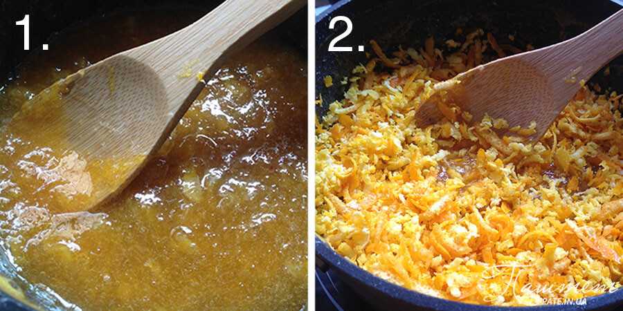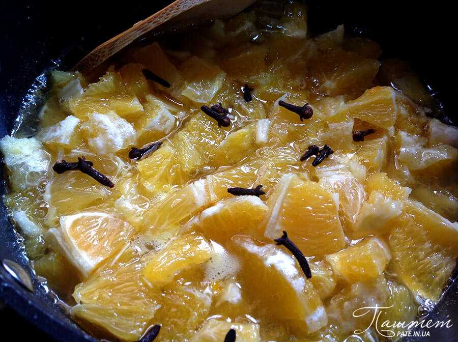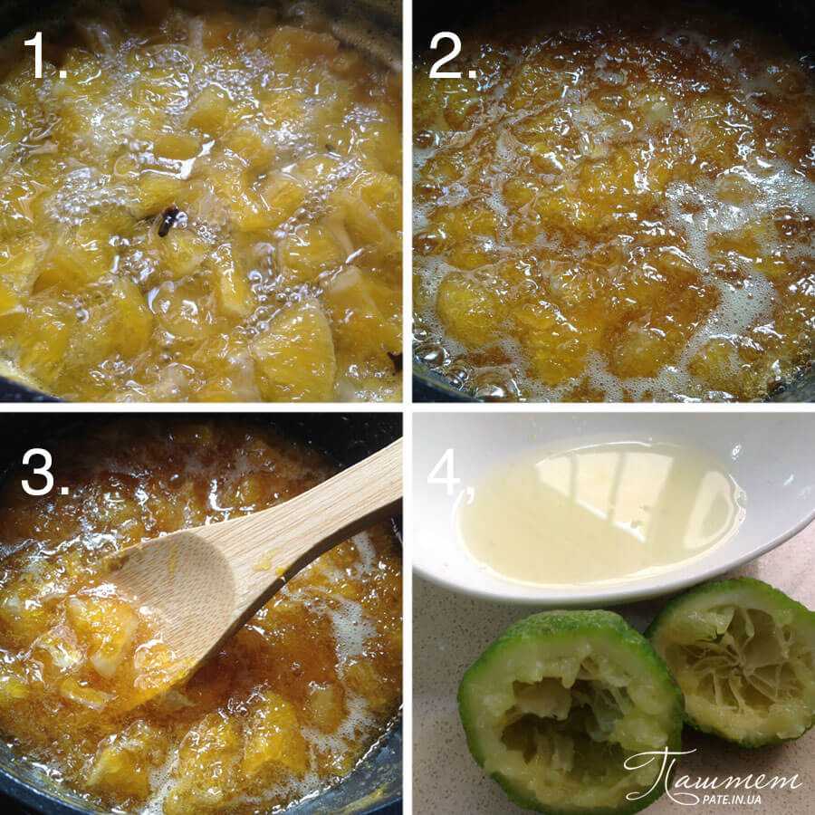 Стадии его превращения из сиропа с апельсинами в густую карамельную массу видны на фото ниже. На последнем этапе добавляем лимонный сок, удаляем специи.
