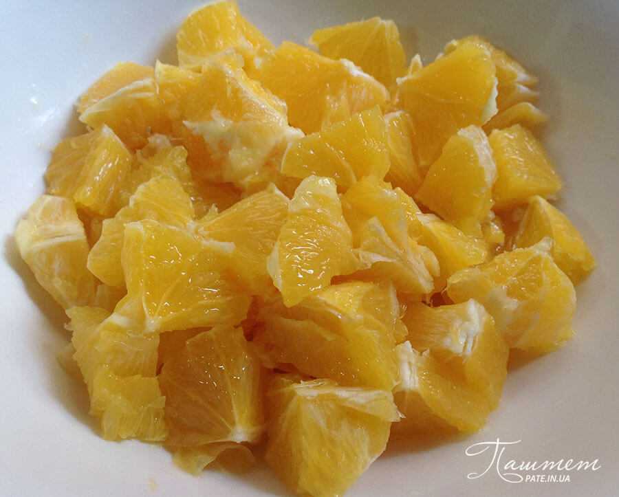 Шаг 2: очищаем белую часть острым ножом. Максимально удаляем перепонки и семечки, нарезаем цитрусовые мелкими кусочками.