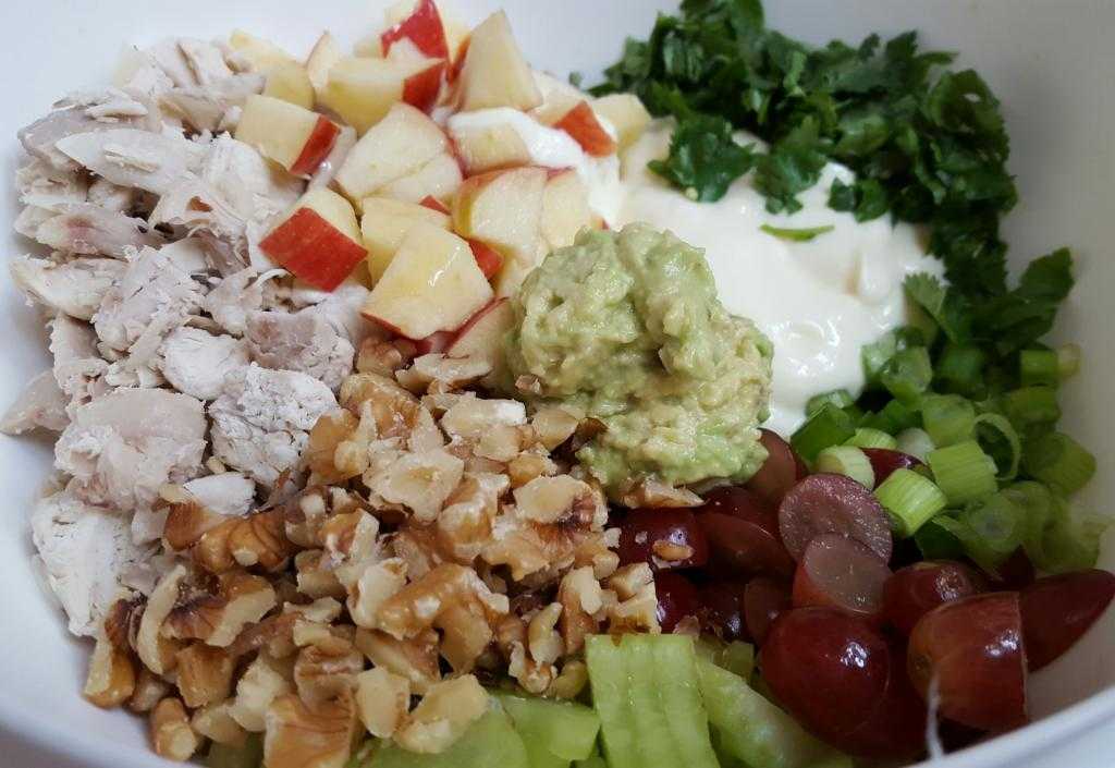 Салат под греческим йогуртом с курицей, укропом, виноградом, сельдереем и миндалем. Простой, полезный вариант классического куриного салата: сливочный и хрустящий.