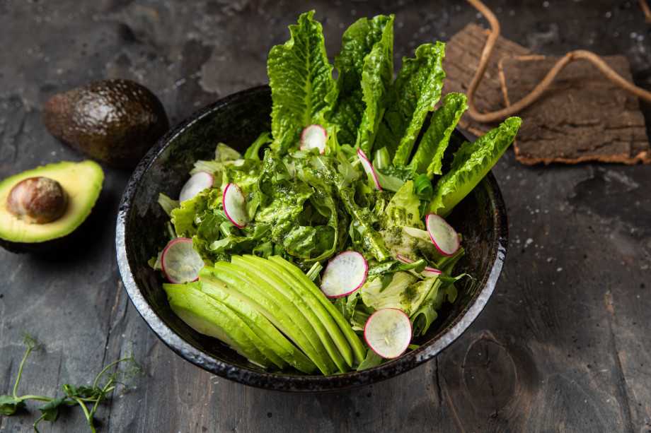 Листья салатов рукколы, романо, айсберга (можно и любую другую смесь салатных листьев) промываем, даем воде стечь. Рвем руками и опускаем в глубокую миску. Очищенный авокадо режем пополам, вынимаем косточку, тонко нарезаем и выкладываем на листья салата. Украшаем сверху кружочками редиски.