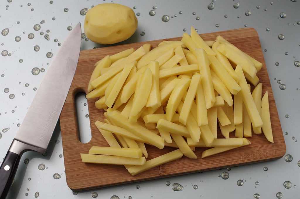 Почистите картошку и нарежьте ее соломкой (резать, в общем, можно как угодно)