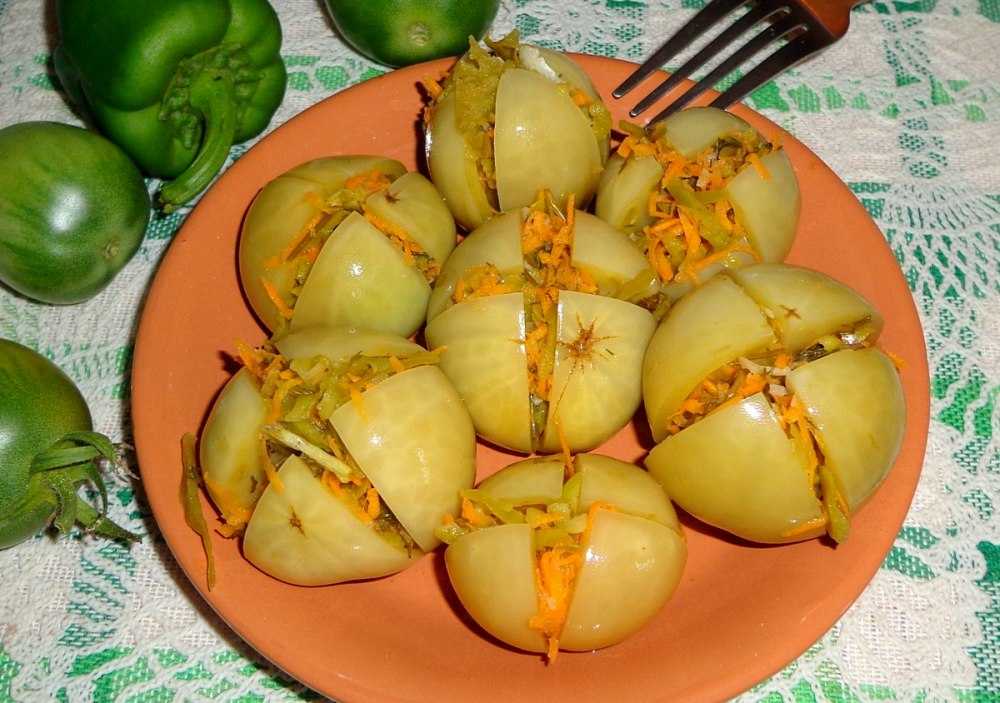 - Зеленые помидоры можно также нафаршировать зеленью и специями, разрезав пополам.