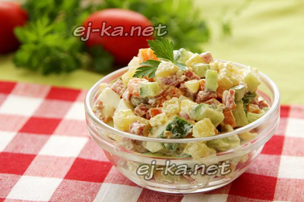 Это самый распространенный рецепт зимнего салата. Основная его особенность состоит в использовании колбасы вместо мясной составляющей блюда. Это упрощает и ускоряет процесс приготовления. Кроме того, колбасу легче аккуратно нарезать. Такой салатик прекрасно подходит, когда время для приготовления ограничено.