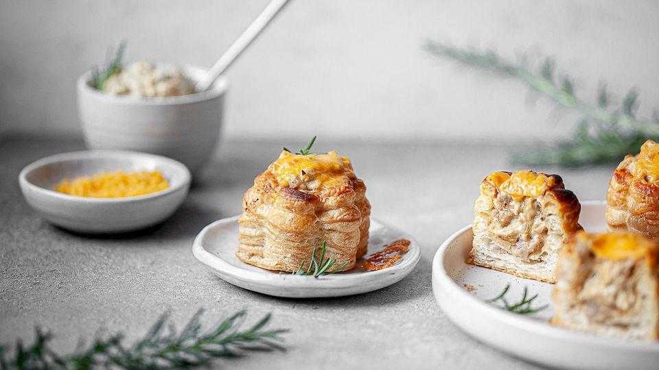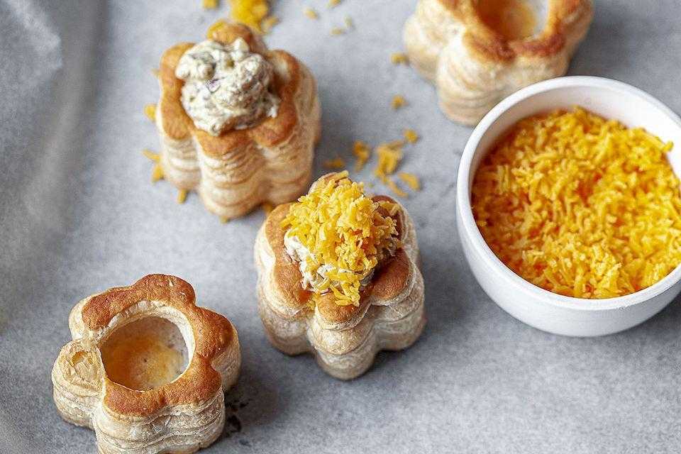 Несколько слов о белых грибах. Они считаются благородными грибами благодаря прекрасным вкусовым качествам и питательным качествам. Следуя семейной традиции, я собирал белых грибов в лесу, когда жил в России. Хотя они не так распространены в Европе, их можно купить в супермаркетах. Почему белые? Они придают жульену особую мягкую текстуру, которая прекрасно сочетается с хрустящей сырной корочкой. В России жульен обычно подают в маленьких алюминиевых формочках, но мы приготовим его в слоеных стаканчиках, которые можно найти в любом магазине.
