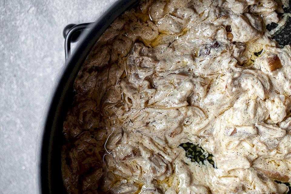 - Вливаем сливки, перемешиваем, солим, перчим. Продолжаем готовить грибную смесь на огне 10-15 минут. Учитывайте, что все будет еще и запекаться. Не пережарьте.