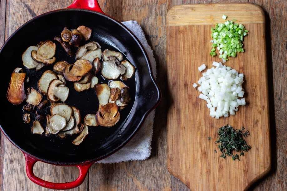 - Нагрейте 2 столовые ложки масла или сала в сотейнике до почти курения. Добавьте белые грибы и готовьте на среднем огне, пока они не подрумянятся и не станут карамелизированными, время от времени помешивая, около 5 минут. Снимите белые грибы со сковороды и приправьте щепоткой соли и перца, затем добавьте оставшуюся столовую ложку масла и обжарьте лук и чеснок на среднем огне или пока они не станут прозрачными и полностью приготовленными.