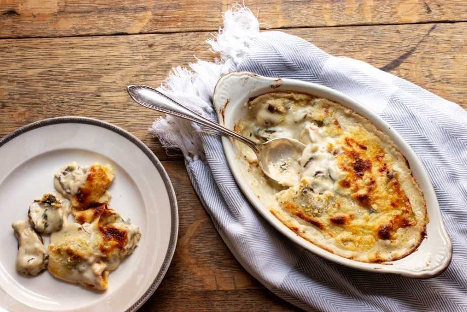 - На этом этапе смесь должна быть густой и кремовой, с консистенцией немного гуще, чем сливочный соус. Переложить смесь в безопасную для выпечки в духовке и выпекать до образования пузырьков и коричневого цвета, около 15 минут, в зависимости от того, есть ли у вас конвекционная печь или нет. Дайте жульену остыть в течение 5-10 минут перед подачей на стол.