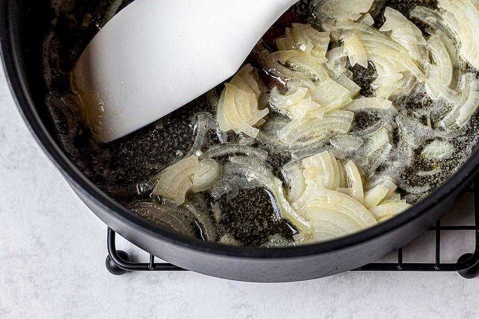 Отдельно растопить оставшееся масло. Выложить лук, обжарить его, помешивая, до прозрачности (3-5 минут на среднем огне).